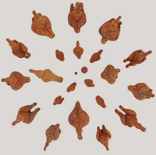 “In acelasi vas de lut au fost descoperite si 21 de conuri mici, tot din lut. Acestea erau strapunse la varf. Cum am gasit si 61 de margele intregi si alte cateva bucati care, reconstituite, intregeau numarul margelelor la 63, dintre care doar 21 de bilute erau partial perforate, am spus ca pot fi compuse cu conurile. Intr-adevar, prin intermediul unui fir subtire de lemn, am unit bilutele cu conurile, iar ceea ce a rezultat a fost redarea unor forme falice stilizate. Vedeti, sunt 21 astfel de forme falice, tot atatea cate statuete feminine sunt in tezaur. Acest tip de reprezentari falice cu cap mobil a fost gasit si in culturile eneolitice din alte regiuni europene”, a mai descris prof. univ. dr. Ursulescu.